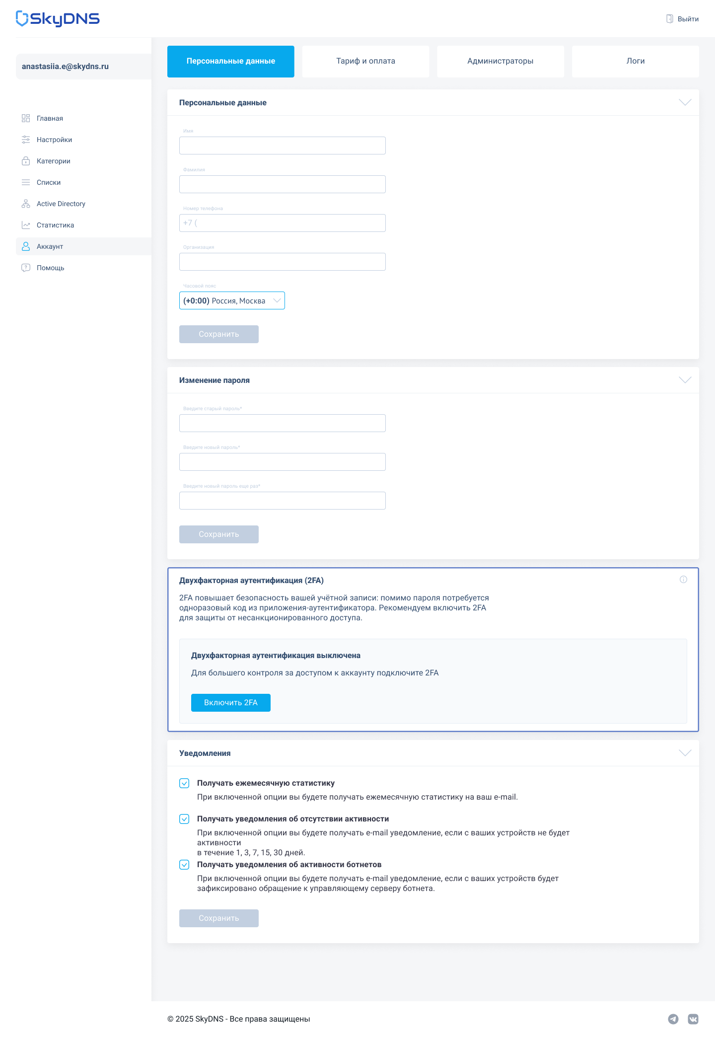 2FA обеспечивает дополнительный уровень защиты: даже если логин и пароль станут известны злоумышленникам, доступ в систему останется защищённым. При включении опции вход в систему будет возможен только после ввода одноразового кода из приложения-аутентификатора.