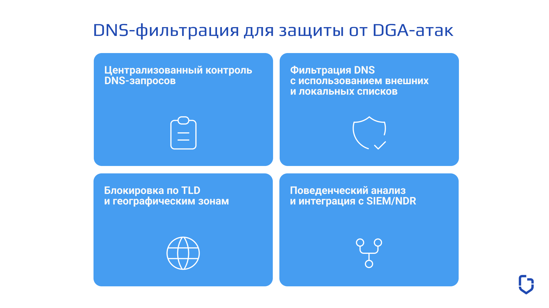 Поскольку генерация доменов позволяет злоумышленникам менять инфраструктуру связи ежедневно, организациям важно выстраивать защиту на уровне DNS и сетевой инфраструктуры. Это дает возможность перехватывать вредоносный трафик до того, как произойдёт установка соединения с управляющим сервером (C2).