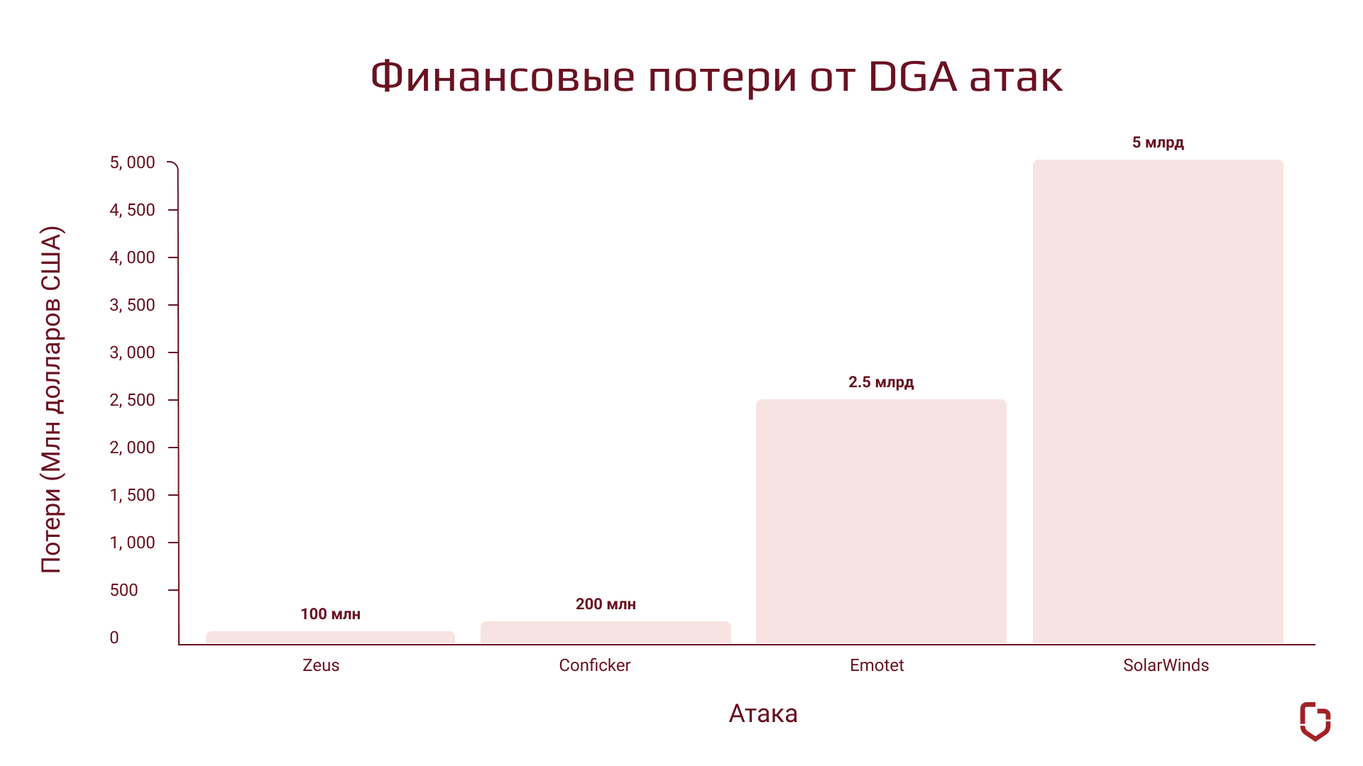 Инфраструктурное заражение. Через DGA могут распространяться вредоносы, создающие внутренние бэкдоры, шифровальщики или инструменты lateral movement, приводя к заражению всей корпоративной сети.