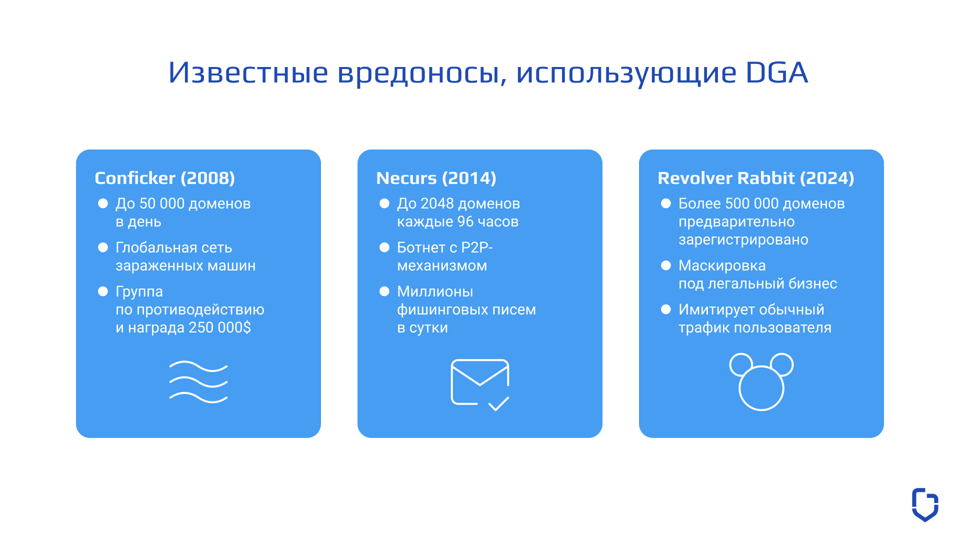 Ранее уже упомянутый и один из самых известных примеров использования DGA — это червь Conficker, впервые обнаруженный в 2008 году. Уже через год он заразил миллионы машин в более чем 190 странах. Его живучесть во многом обеспечивалась встроенным механизмом генерации нейтральных и национальных доменных имён: в более поздней версии (Conficker C) вредонос генерировал множество доменов (до 50000) в день. Благодаря этому подходу C2-серверы могли быть заменены автоматически, что затрудняло их обнаружение и блокировку.